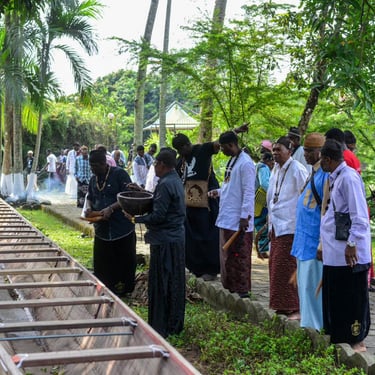 C’est au cœur du village BONAMOUSSADI, lieu sacré de nos traditions, que la majestueuse MBELA BOLO a été présentée aux eaux du Wouri, sous les chants, les prières et les vivats de tout un peuple.
